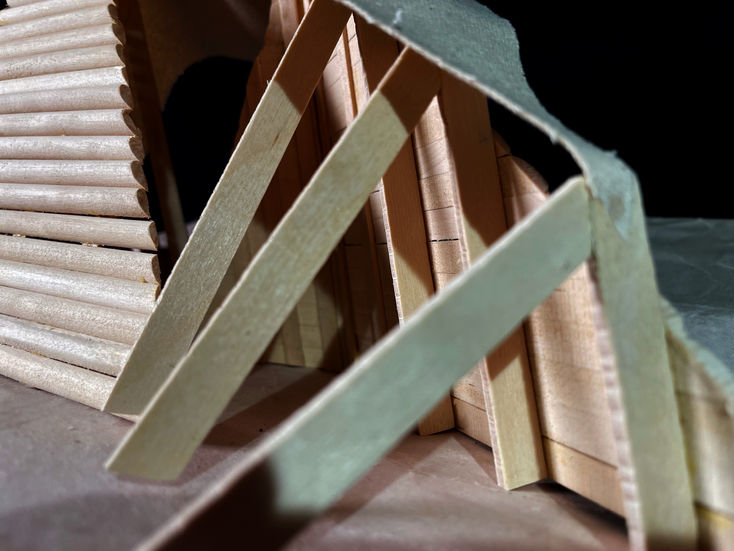 Ptarmigan Logs is an inhabitable wall structure located in Colorado’s Rocky Mountain National Park. Despite being in harsh conditions, Ptarmigan Logs’ design is centered around sheltering inhabitants from the wind. Inspiration is taken from log cabins and igloos. The influence of log cabins is seen in the large triangular panels, with the exterior pattern of the wood mimicking that of a traditional log cabin. The influence of the igloos is from the idea of using the snow that builds up on the walls as insulation for the space inside, similar to in an igloo.
